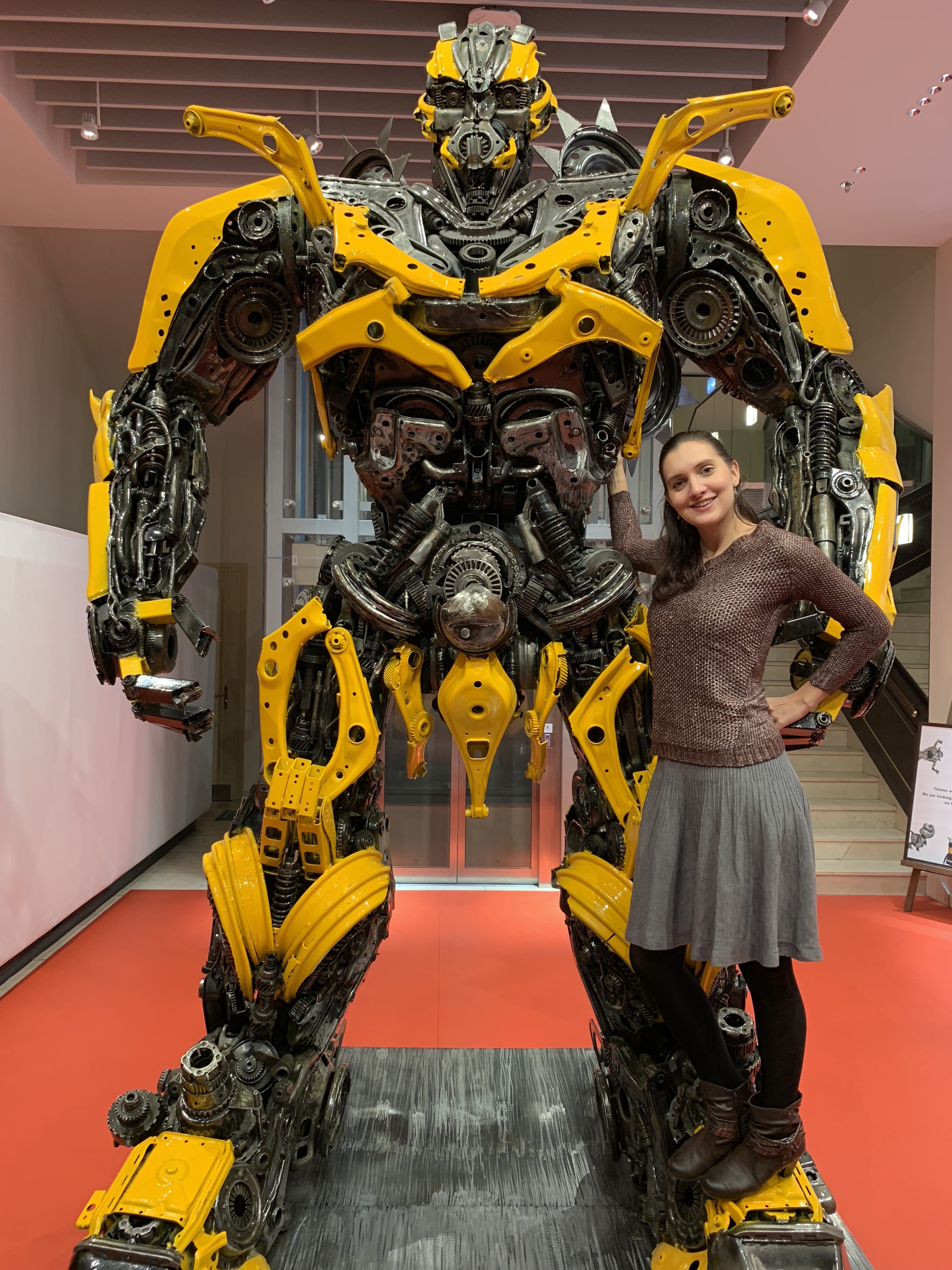 Když nás stroje přestaly bavit (cca první hodina výstavy), šli jsme do druhého patra. Po cestě jsem si ještě nemohla odpustit snahu políbit transformera Bumblebeeho. Žluťásek je můj oblíbený kovový mimozemšťan. Jak vidíte, i on mě má rád, protože mě držel za zadek. Což dělal i na dalších fotkách.